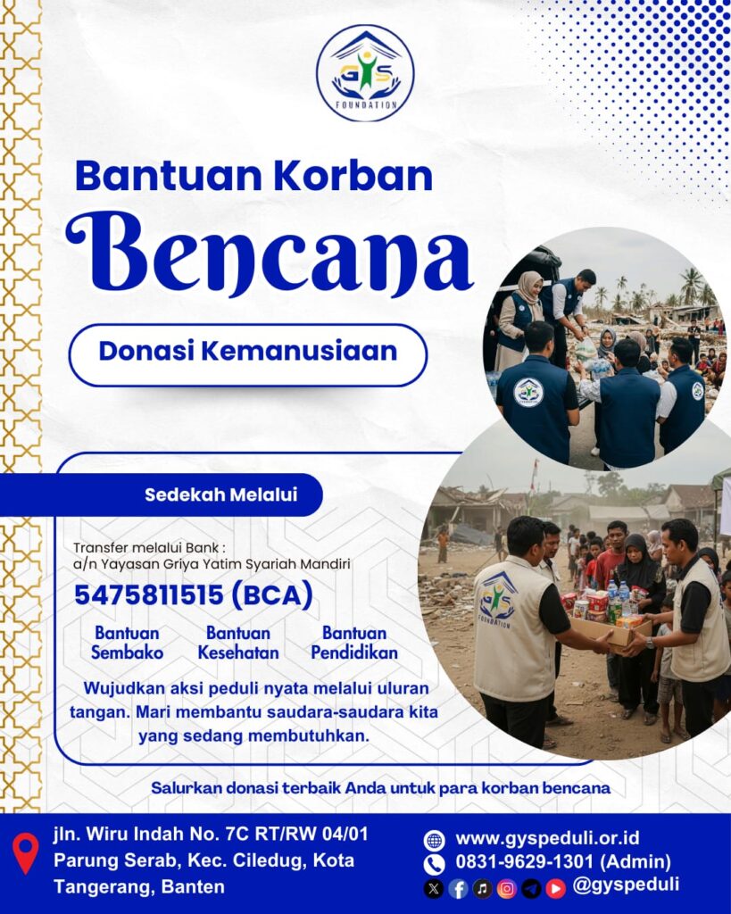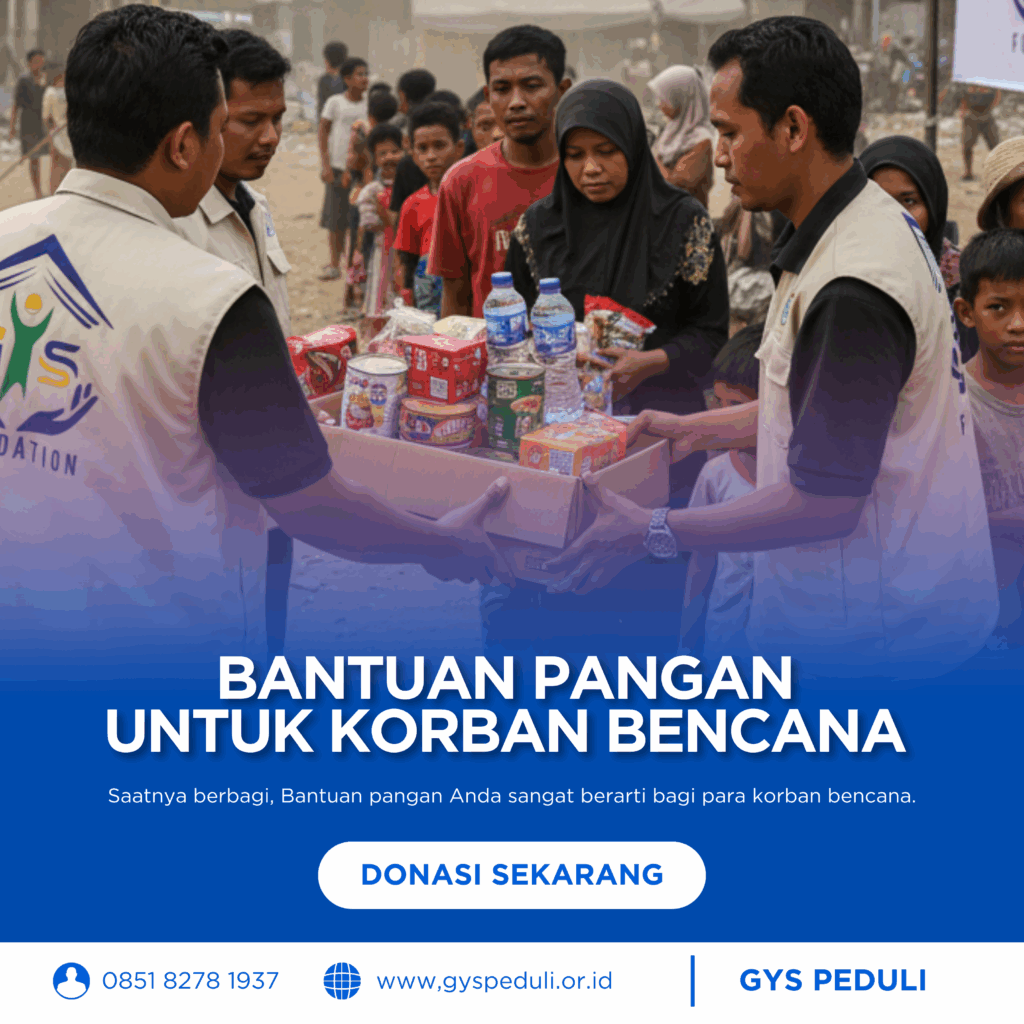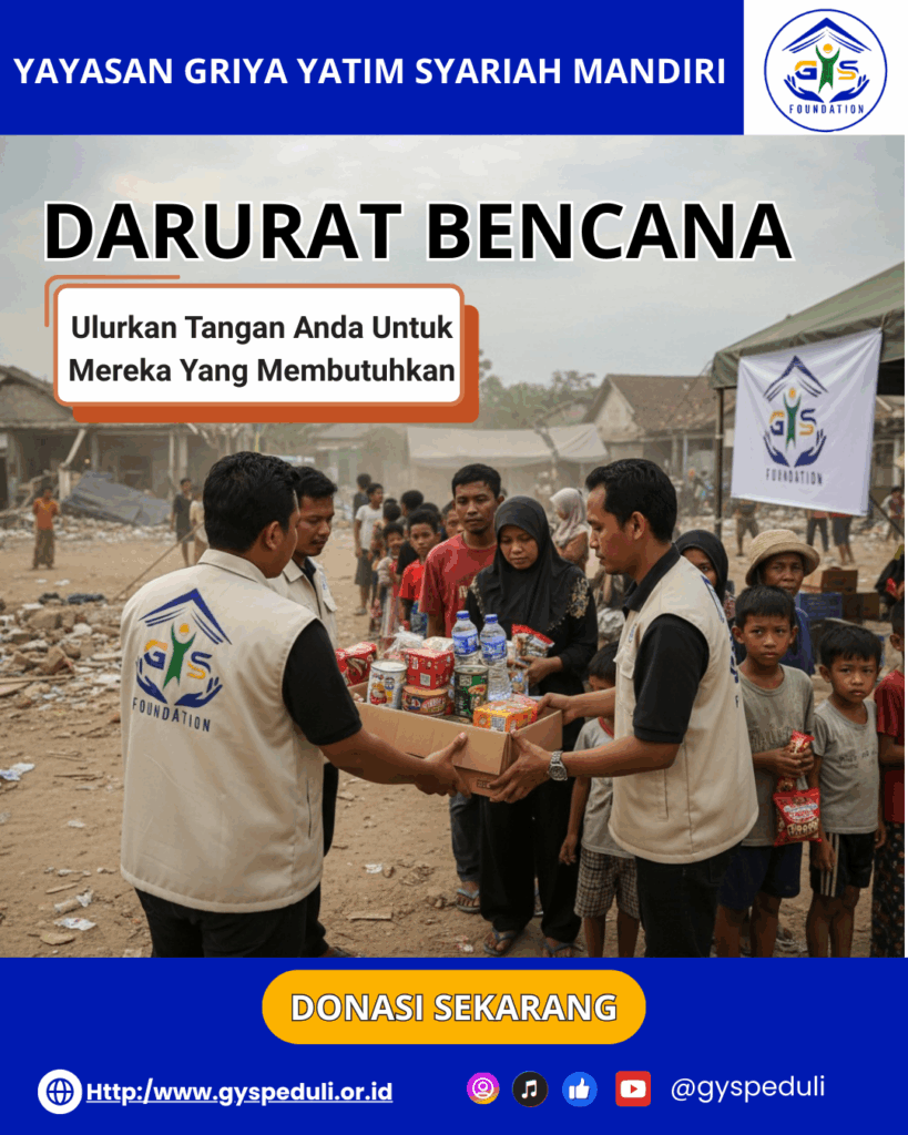 Melalui program ini, Yayasan Griya Yatim Syariah Mandiri berkomitmen untuk bergerak cepat menyalurkan bantuan pangan darurat langsung kepada para korban yang bencana terdampaki. Kami percaya, setiap bungkus makanan yang kita berikan bukan hanya mengenyangkan perut, tetapi juga menyalakan kembali harapan hati mereka. Donasi dari Sahabat adalah bahan bakar utama bagi gerakan kebaikan ini untuk sampai kepada mereka yang membutuhkan.
