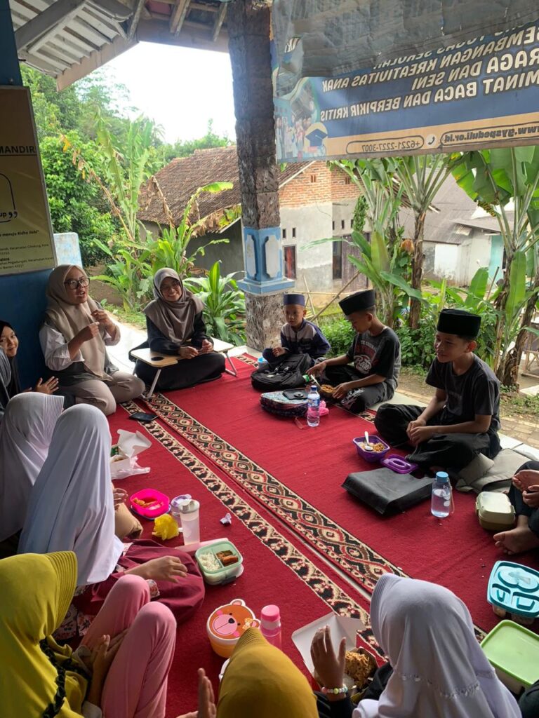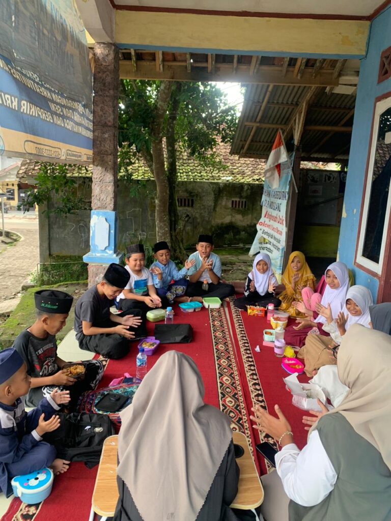 Setelah doa, kegiatan dilanjutkan dengan makan bersama. Anak-anak duduk melingkar, berbagi makanan, dan menikmati kebersamaan dalam suasana sederhana namun penuh makna.